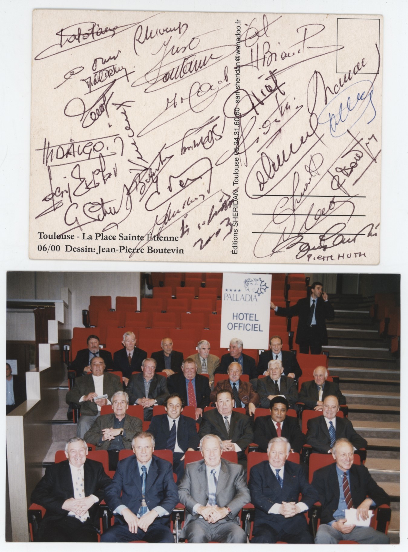 Modern postcard signed to reverse by many great footballers who attended a reunion of the 1958 Football World Cup in 2003. These include Just Fontaine, Eusebio, Michel Platini, Bobby Charlton, Wisniewski, Vincent and Hidalgo. The others are further members of the French squad from that tournament. The event had been organised by Fontaine and these belonged to Maryan Wisniewski. Comes with a photograph of most of the attendees sitting in rows.