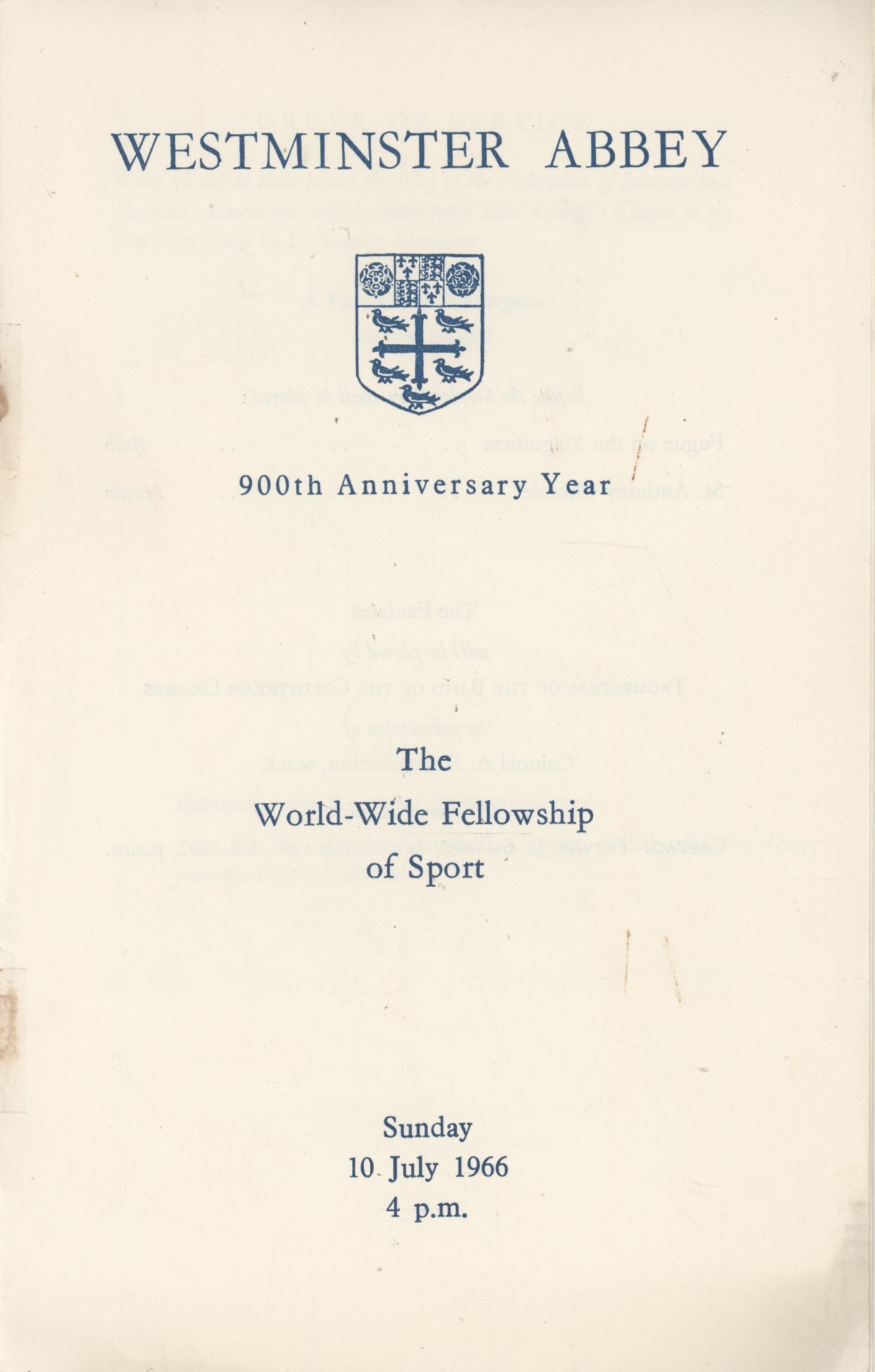 Order of Service for a celebration of The World-Wide Fellowship of Sport, held at Westminster Abbey on the eve of the 1966 World Cup, July 10th. Once all were seated Sir Stanley Matthews accompanied the flag of FIFA into the Abbey to a fanfare of trumpets. Readings during the service were made by Virginia Wade, Menzies Campbell, Conrad Hunte and Jimmy Armfield.