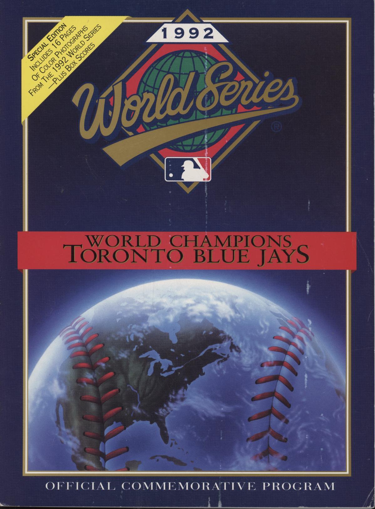 Glossy illustrated souvenir review of the 1992 baseball World Series, won by the Toronto Blue Jays.