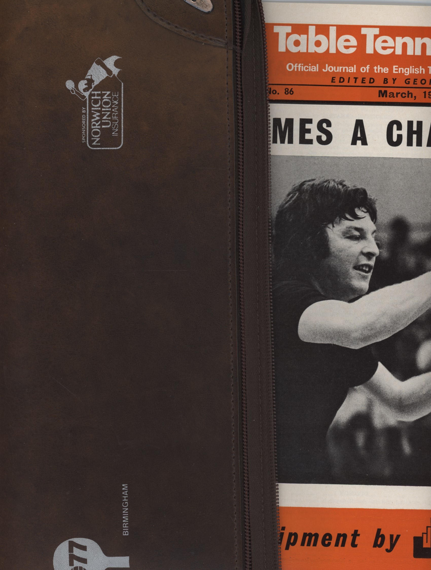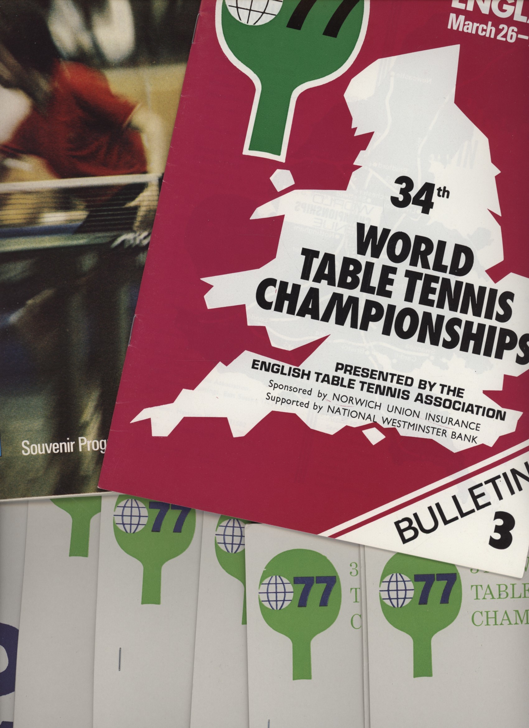 The official souvenir programme for the event held at the NEC Birmingham 26 March - 5 April 1977 alongside the Sportacus '77 Sports & Leisure Exhibition, in a handsome lockable leather wallet issued for the occasion and with other items including seven of the daily results records plus Table Tennis News of March 1977 and the special information Bulletin issued to delegates.