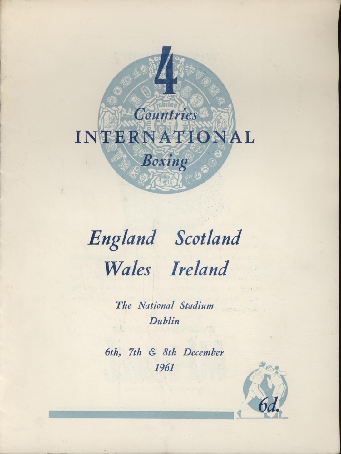 Official programme for the fights at the National Stadium Dublin on 6-8th December 1961. The countries taking part were England, Scotland, Wales and Ireland.