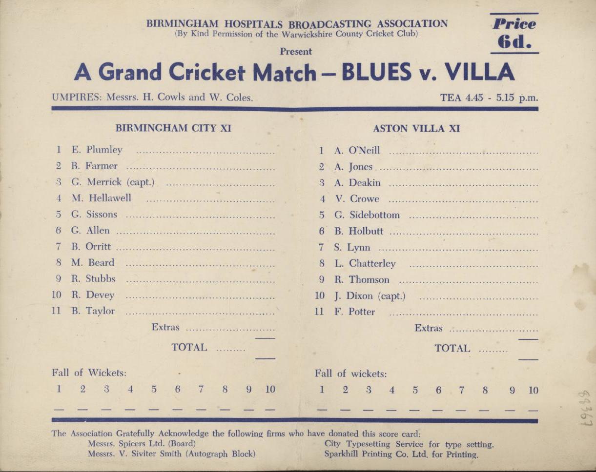 Cricket » Cricket Scorecards » Representative Teams » BIRMINGHAM CITY V ASTON VILLA (EDBASTON) 1958 CRICKET SCORECARD