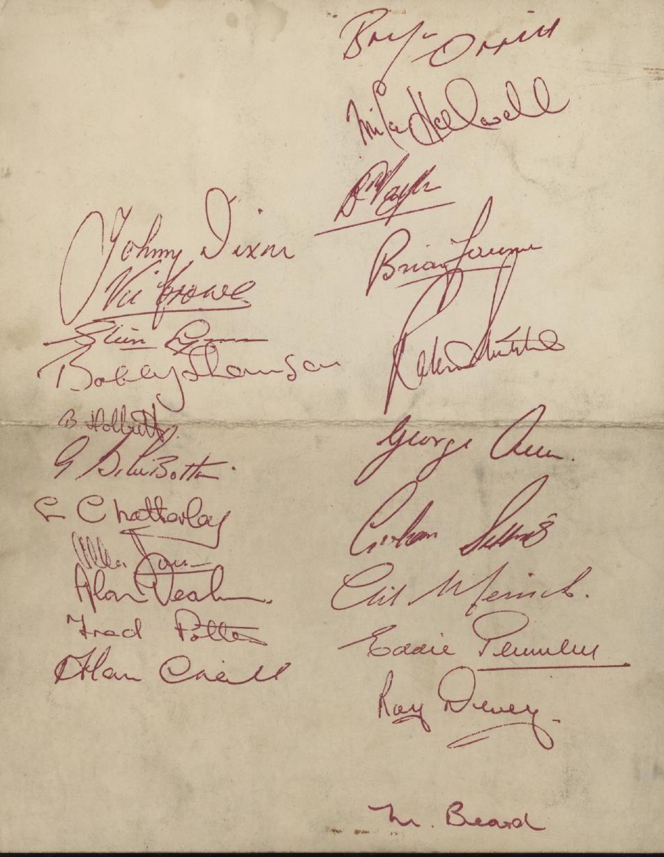 Official cricket scorecard for a match between a Birmingham City XI and an Aston Villa XI, played at Edgbaston in 1958. No date is given but it is likely to have been in 1958, based on the players listed. Facsimile autographs of the players to reverse. Players included Gil Merrick, George Allen, Eddie Plumley, Brian Taylor, Johnny Dixon and Vic Crowe.