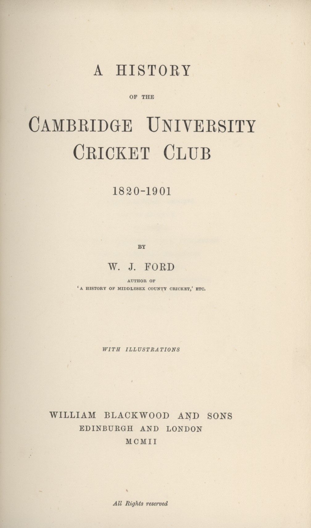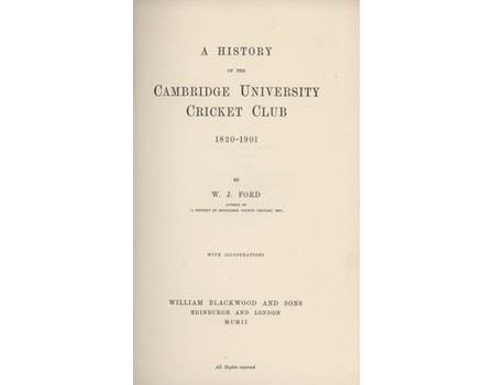 Thick & large 8vo. xi + 562pp. Frontispiece (showing a match in progress on Parker's Piece, from the Rischgitz Collection), 6 plates. Original light blue cloth with Cambridge CC insignia embossed to upper board in gilt, gilt title to spine. Very good condition.
