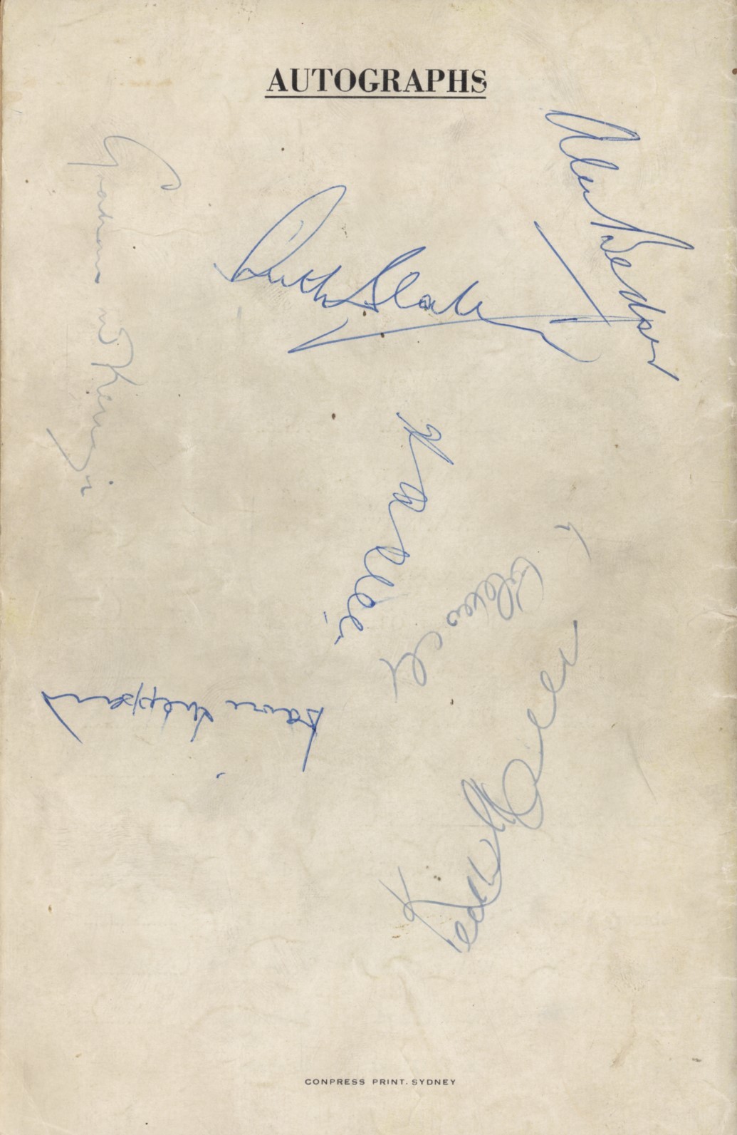 Paperback. 8vo. 64pp. Illustrated covers, rubbed. Good condition. Signed to the back cover in ink by Alec Bedser, Allen, Coldwell, Sheppard, Keith Miller, Graham McKenzie and one other.