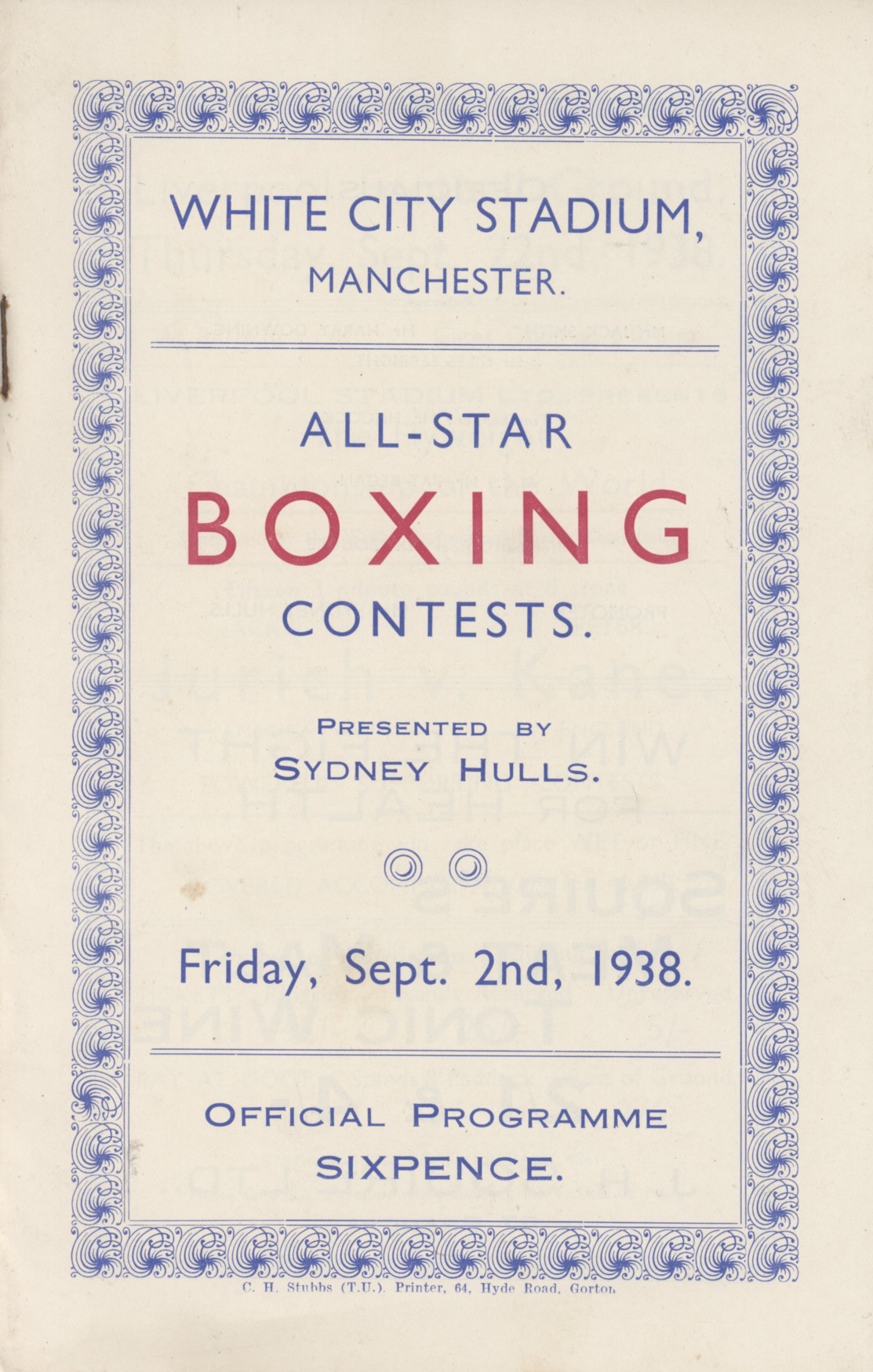 Official boxing programme for the fight held in Manchester on September 2nd, 1938. Eric Boon and Eric Dolby also on the card.