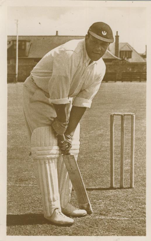 Original sepia postcard of Alma Victor "Champ" Hunt (1910-99), the great Bermudan cricketer and administrator who had trials for the West Indies in 1933 before moving to Scotland, where he played for Aberdeenshire and also for Scotland against the Australians in 1938. In a match against West Lothian Hunt once took 7 for 11 in their total of 48 and then, opening the batting, ended up 49 not out (in just 25 minutes)!