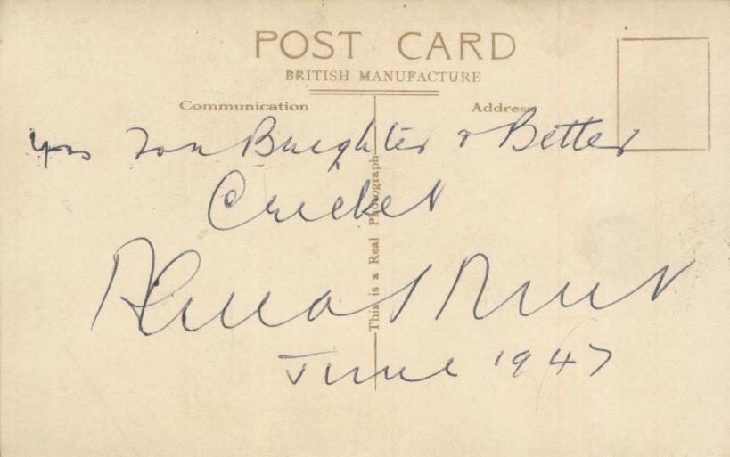 Signed very nicely on the reverse in ink by Hunt with the caption "Yours for brighter and better cricket, Alma Hunt, June 1947". Very good condition.