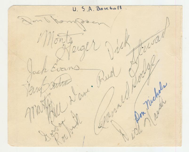 Album page, signed by 11 American baseball players who represented the American "All Stars" on a tour to South Africa in 1955. These autographs were collected on the tour. The team was actually a combination of amateur and college players and was selected by the US Amateur Baseball Federation. Autographs include Don Thompson, a major league player, and Ronald Dodge who was awarded a Purple Heart and who died in Vietnam.
