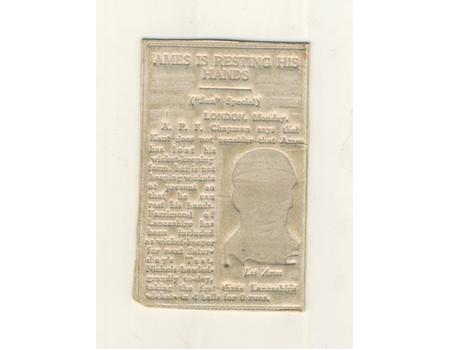 Unusual souvenir card reproducing a short article announcing that Kent and England wicketkeeper Les Ames will hand the gloves to Lancashire's Bill Farrimond (for the Test v South Africa at Lord's in 1935 when Ames played as a batsman), including interesting silhouette of Ames.