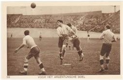 Sepia photo of a heading duel between players of Uruguay and Argentine during the Football Final, Amsterdam Olympic Stadium, 1928. Uruguay won the gold, a result they were to emulate in the first World Cup Final in Montevideo, 1930. White borders. Postally unused. Very good.