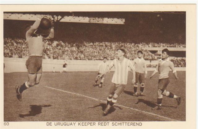 Sepia photo of the Uruguay goalkeeper repelling an Argentine attack during the Football Final, Amsterdam Olympic Stadium, 1928. Uruguay won the gold, a result they were to emulate in the first World Cup Final in Montevideo, 1930. White border. Postally unused. Very good.