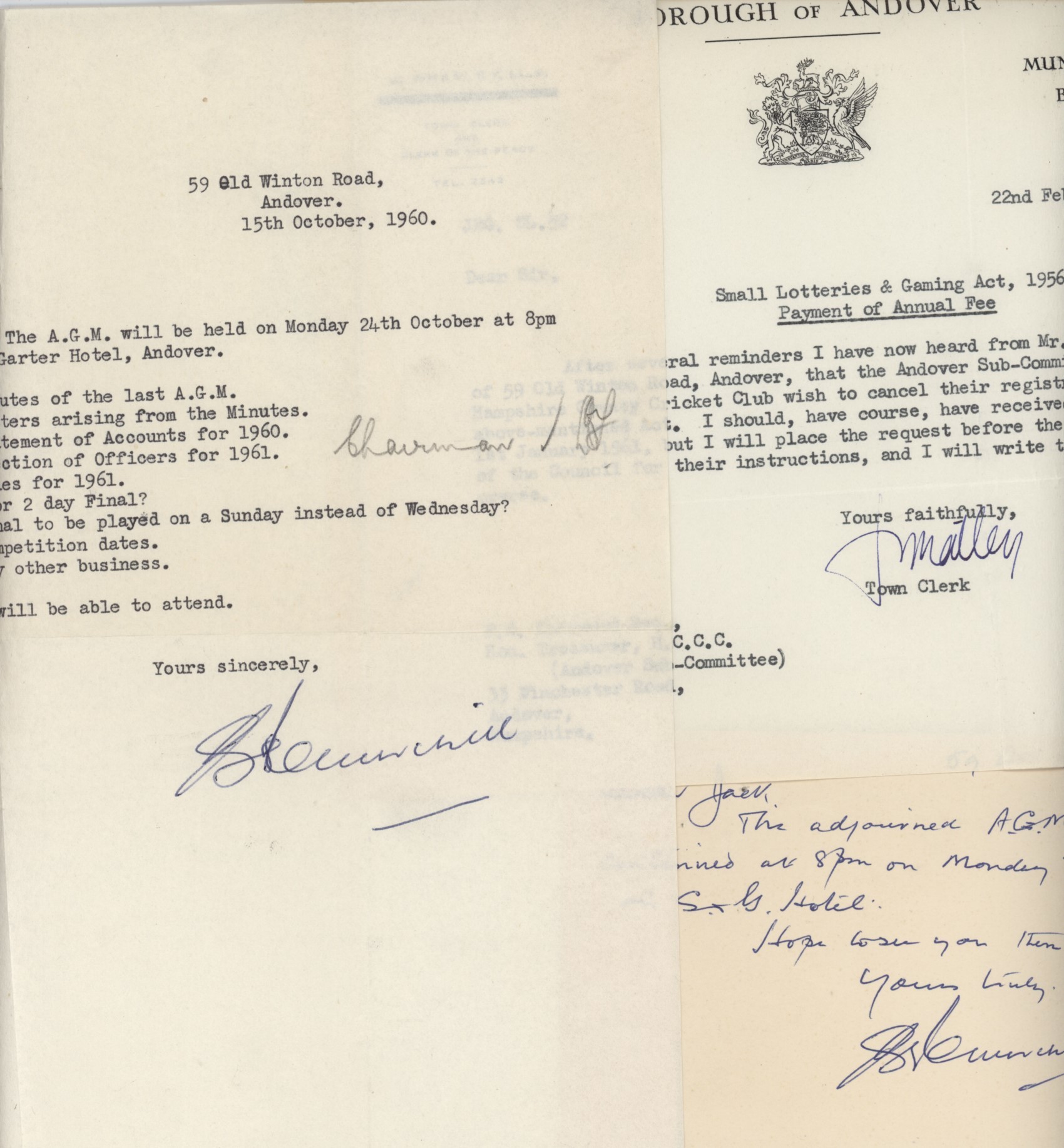 Four Andover Cricket Club statement of accounts - 1947, 1949, 1952 and 1953. Each is a single folded sheet. Also includes a couple of letters from S.S. Churchill, who seems to have been on the club committeee in the early 1960s.