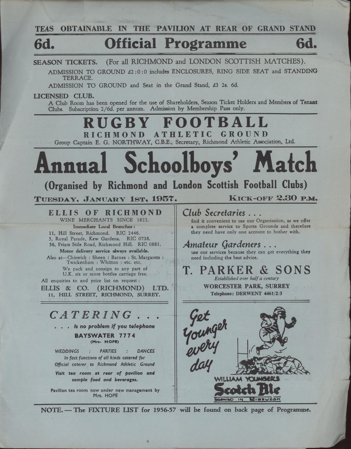 ANNUAL SCHOOLBOYS MATCH 1957 RUGBY UNION PROGRAMME