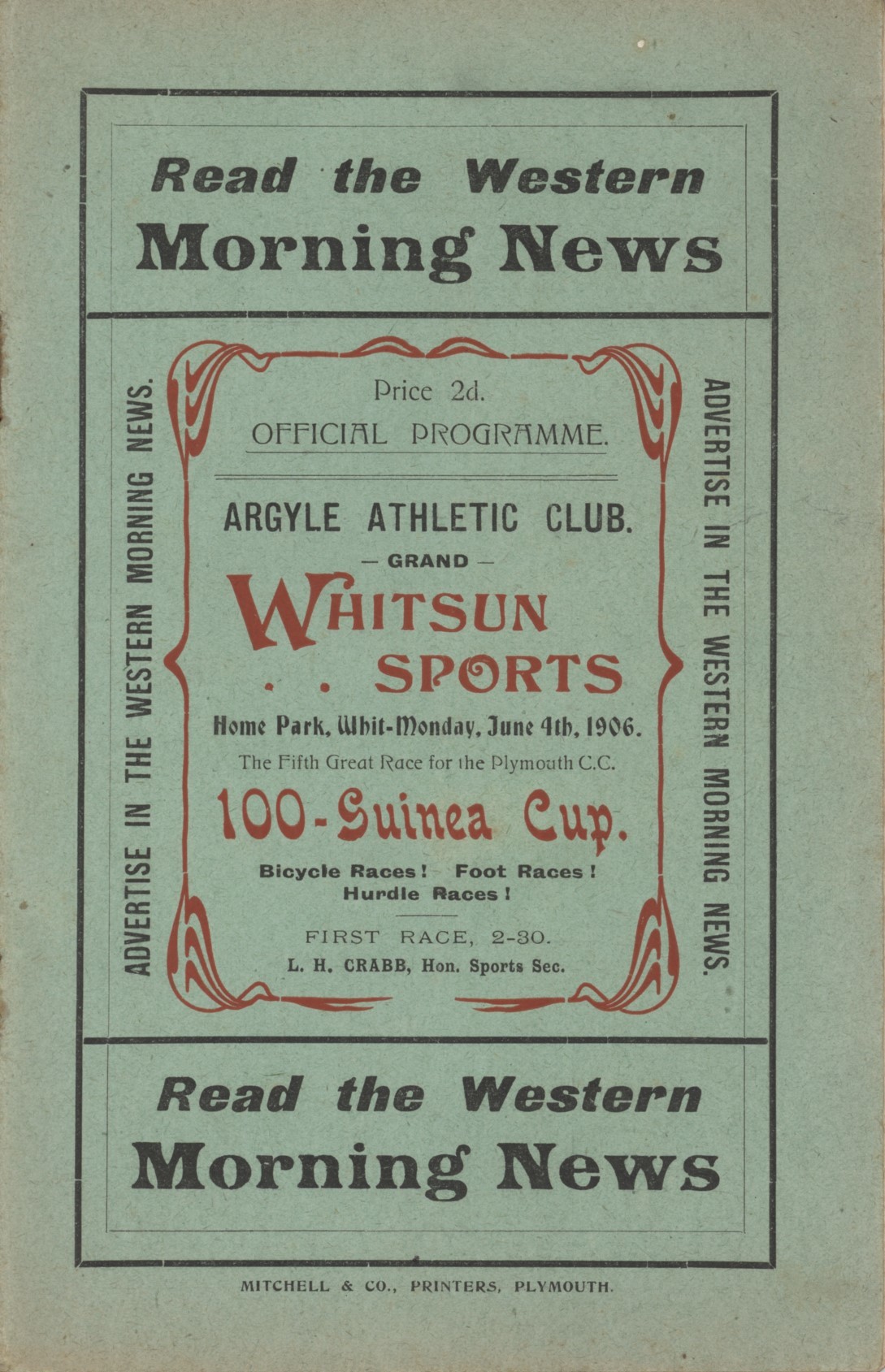 Official programme for the cycling and athletics meeting held at Home Park on June 4th, 1906. Plymouth Argyle Football Club had originally been a part of the athletics club but broke away in 1903, continuing to share the same ground (Home Park).