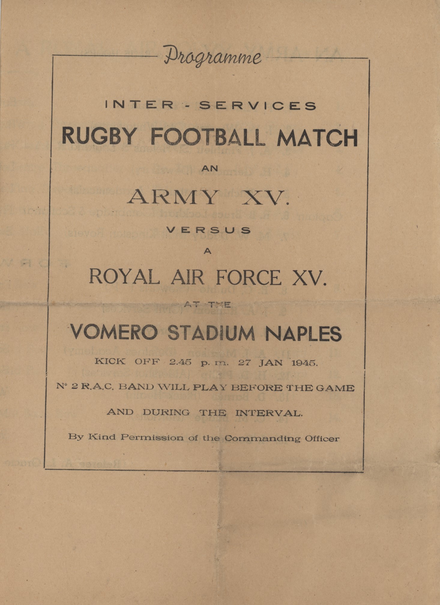 Original programme for the match played at the Vomero Stadium, Naples, on January 27th, 1945. The Army team was captained by R.B. Bruce-Lockhart, the Scottish international.
