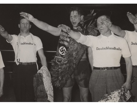 Press photograph of Arno Kolblin and his team giving the Nazi salute after defeating Pierre Charles to become European Heavyweight Champion on March 17th, 1937.