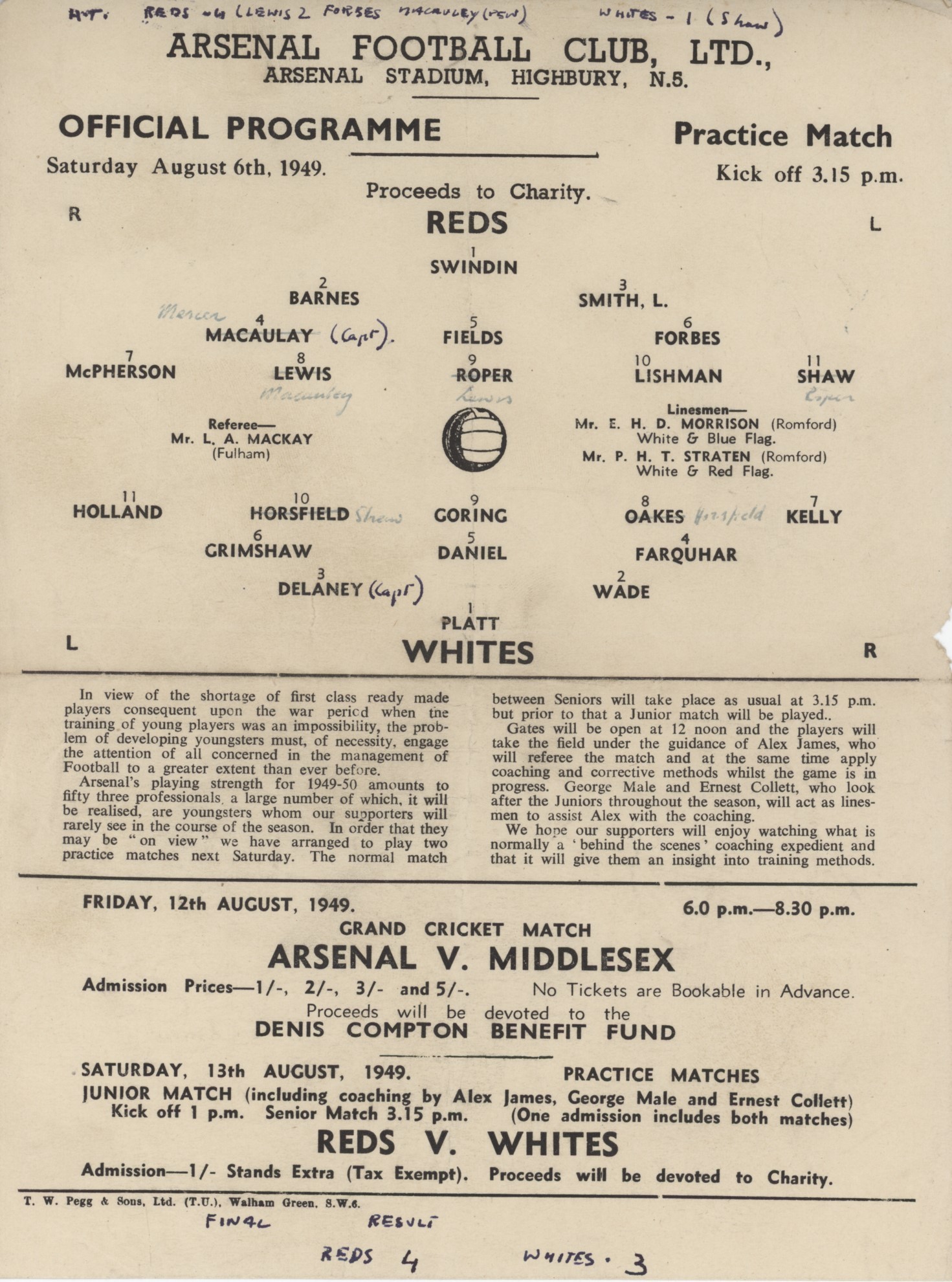 ARSENAL REDS V WHITES (PRACTICE MATCH) 1949-50 FOOTBALL PROGRAMME