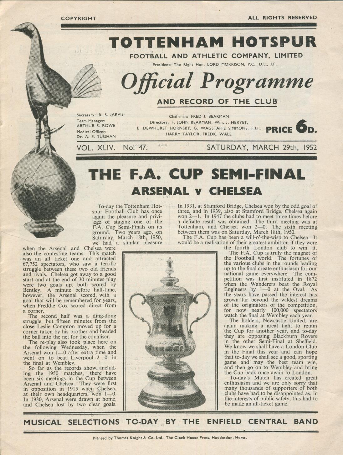 Official football programme for the FA Cup semi-final, played at White Hart Lane on March 29th 1952.