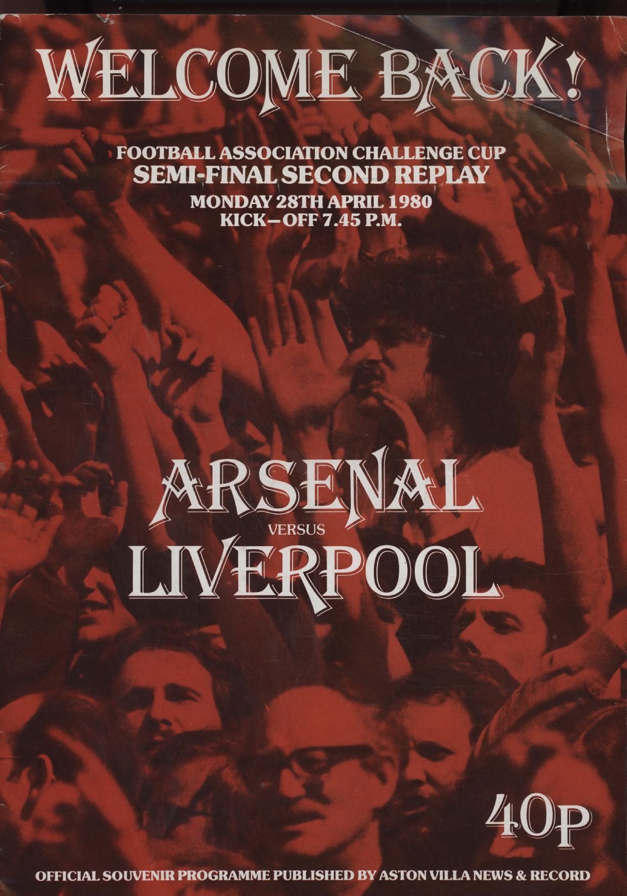 Official football souvenir programme produced by the Aston Villa News & Record for the FA Cup Semi-Final second replay between Arsenal and Liverpool played at Villa Park on 28th April 1980. Yet another draw (1-1), the tie required a third replay at Coventry City's Highfield Road which Arsenal won 1-0.