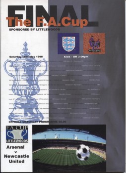 Official programme for the 1998 FA Cup Final between Arsenal and Newcastle United. Arsenal won 2-0 with goals from Anelka and Overmars to complete their second league and cup "Double".