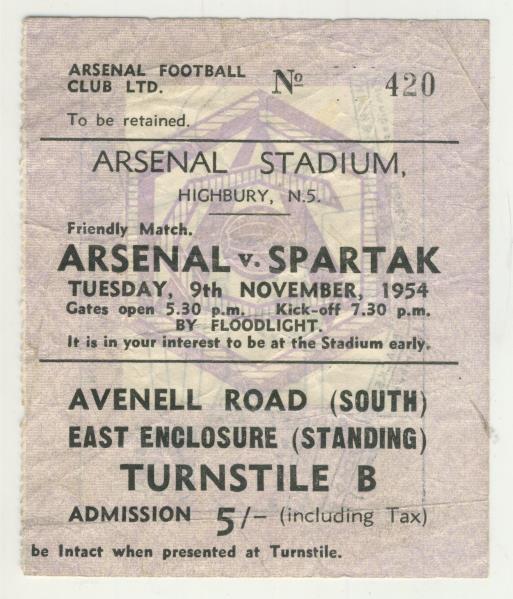 ARSENAL V SPARTAK MOSCOW 1954 FOOTBALL TICKET