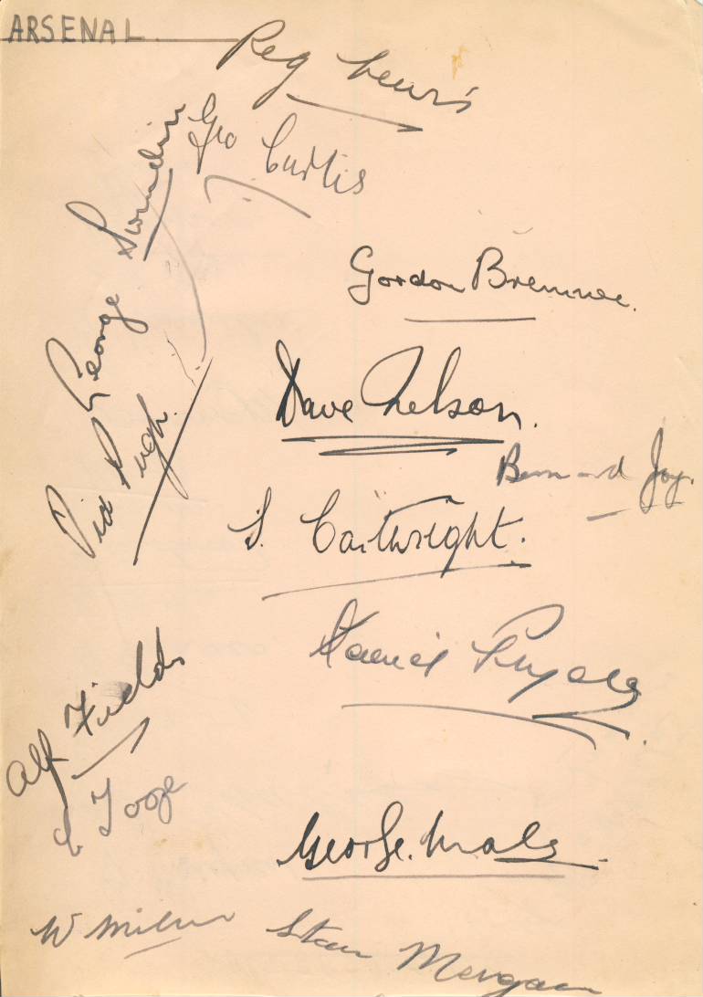 Album page. Signed in ink by 14 Arsenal players from the late 1930s, including Joy, Male, Swindin, Curtis, Nelson, Cartwright, Fields, Morgan, Pugh, Bremner and Lewis. Signed on the reverse by 13 Aldershot players and the Trainer, including Raynor, Kelly, Greaves, Eastwood, Summerbee, Liddell and Chalmers.