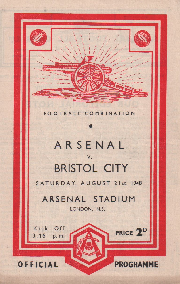 Official football match programme from the Football Combination match played at Highbury on the 21st of August 1948.