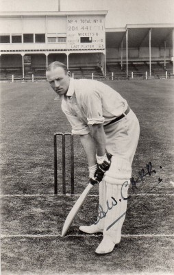 Cricket postcard. Real photograph of Carr posing at the wicket with the scoreboard (441 for 6) in background. Postally unused. In very good condition. Signed nicely in ink by Carr on front.