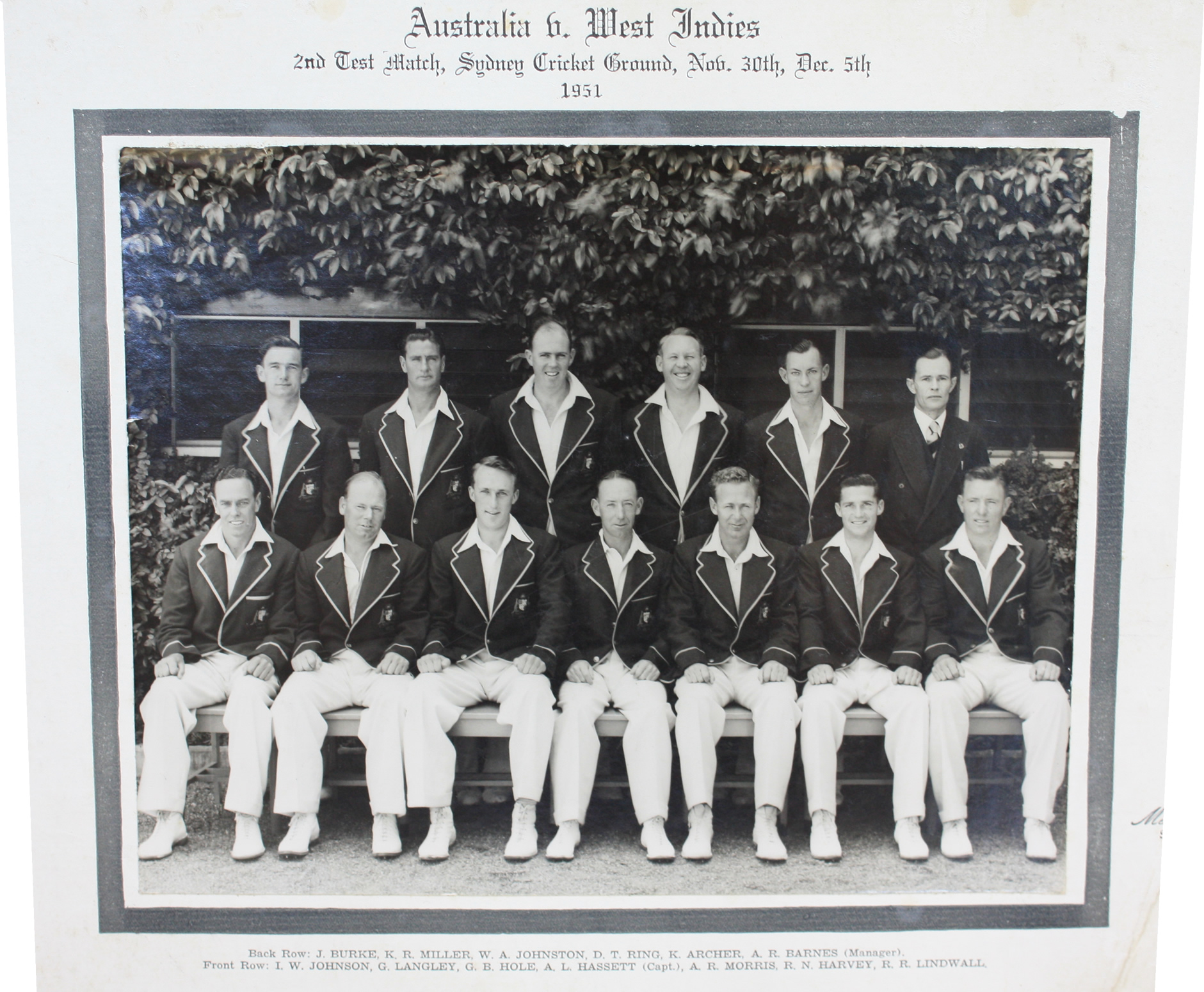 Official photograph of the Australian XIII from the 2nd Test of the 1951 series against the West Indies, played at the SCG. Includes Miller, Harvey, Lindwall and Hassett.