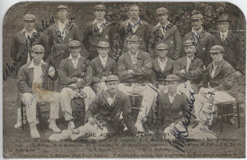 Cricket postcard. Real photograph by Bolland of Southall of the 1921 Australian Cricket team. Title and team list to lower face. Postally unused. Top two corners rounded off. Small stain to centre left, across Mailey's body and signature. Some signatures slightly faded, but still in very good condition. Fully signed by the players - Bardsley, Ryder, Hendry, Gregory, Mayne, Andrews, Mailey, McDonald, Collins, Armstrong, Macartney, Carter, Taylor, Pellew and Oldfield - and the Manager, S. Smith