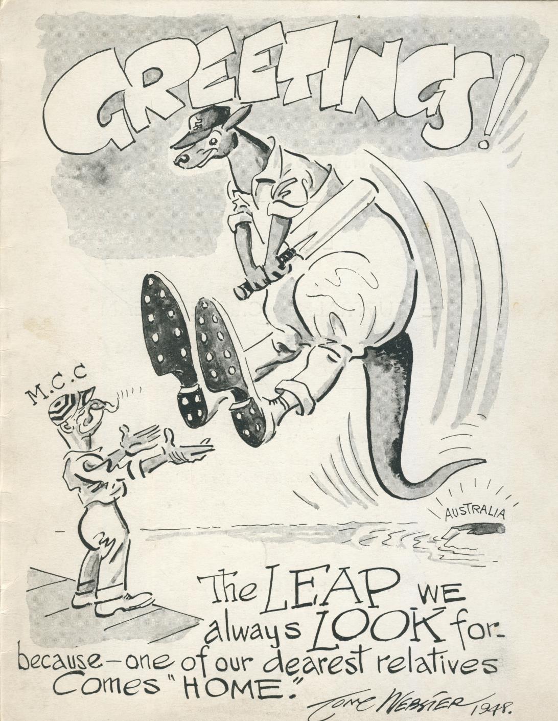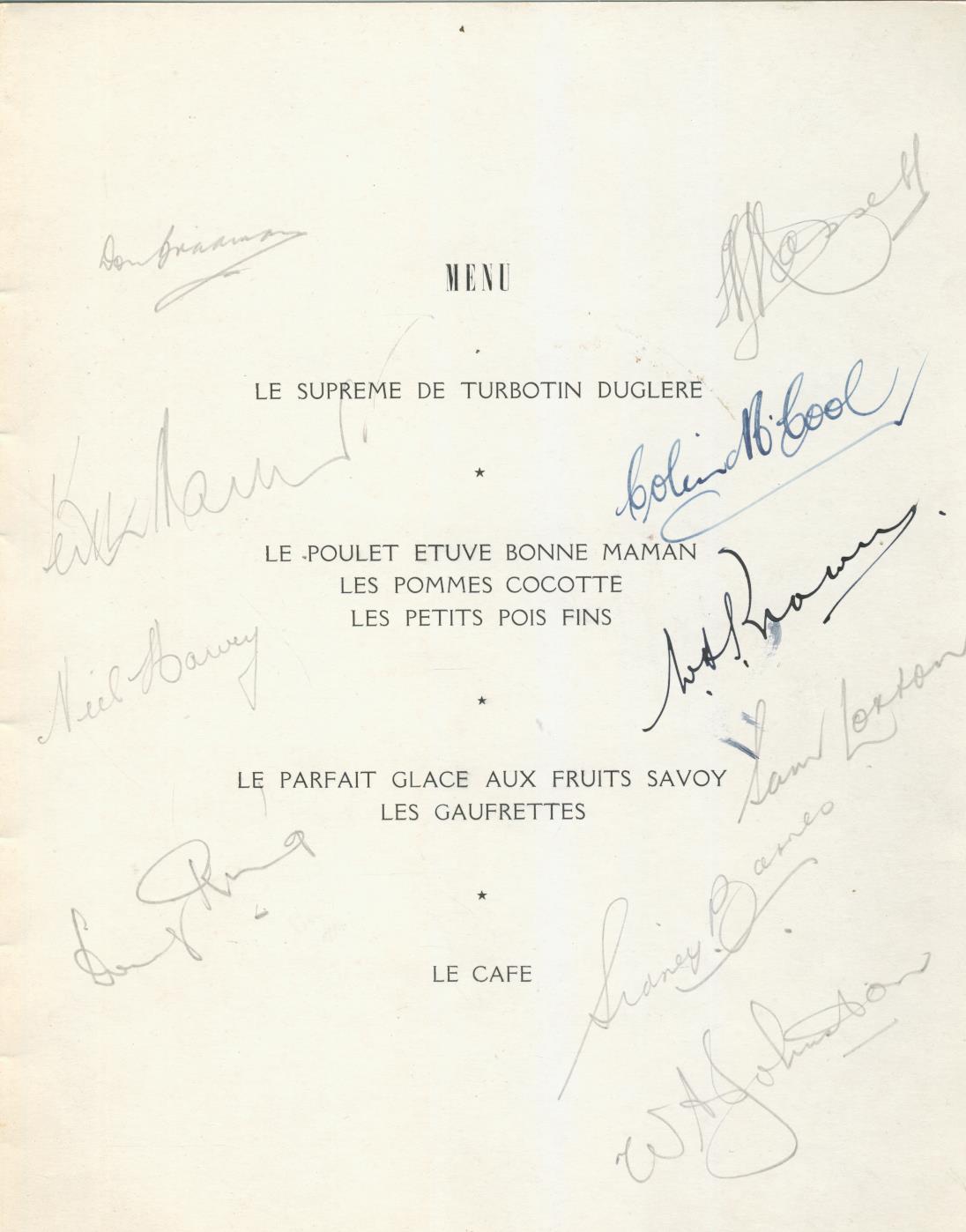 Large menu card for the British Sportsman's Club luncheon to honour the Australian Cricket Team, held at the Savoy Hotel on 20 April 1948. Signed to the inside in pencil and ink by 10 members of the Australian tour party - DG Bradman, KR Miller, RN Harvey, DT Ring, AL Hassett, CL McCool, WA Brown, SJE Loxton, SG Barnes and WA Johnston.