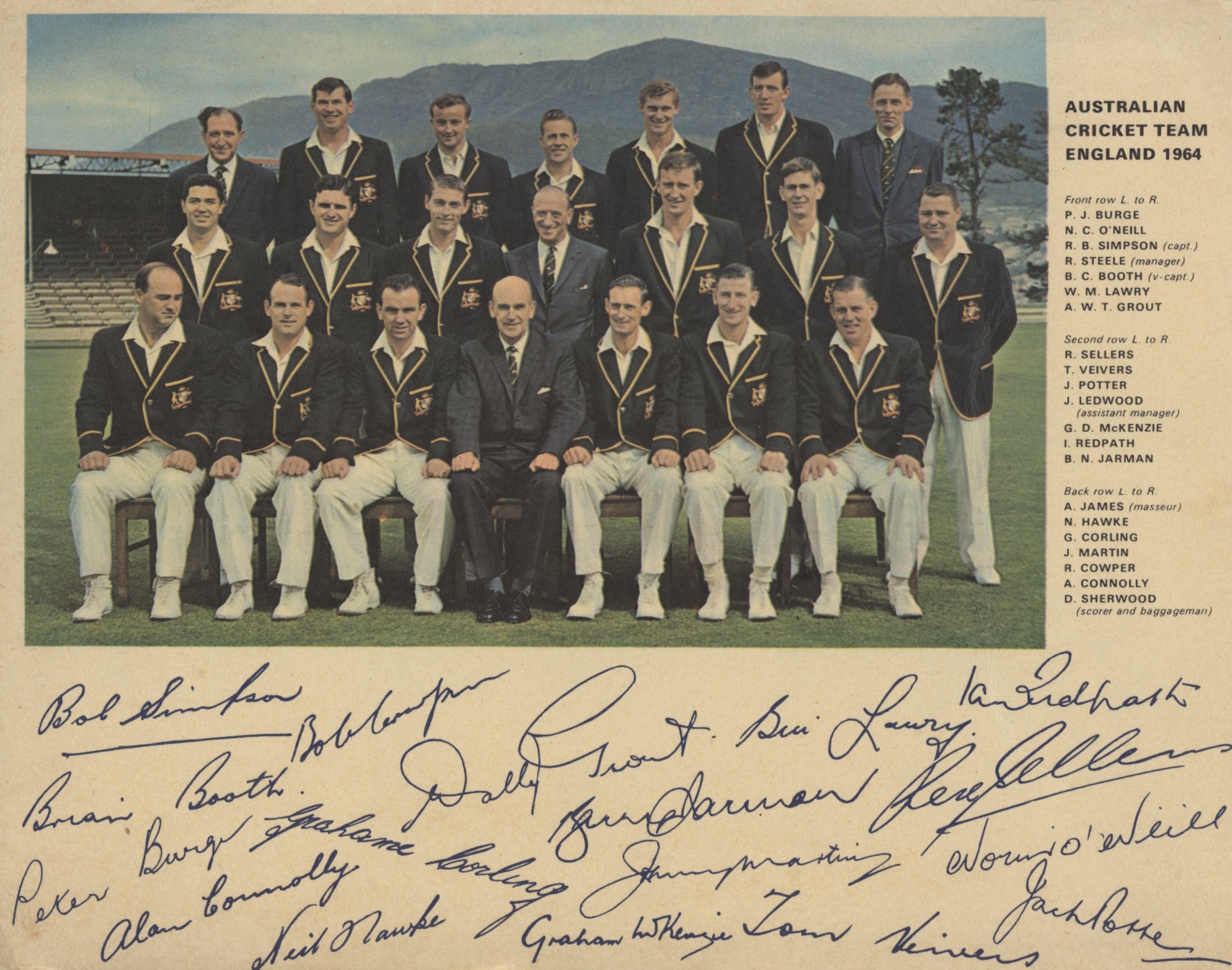 Original souvenir photograph of the Australian cricket team that competed for the Ashes in England in 1964.
