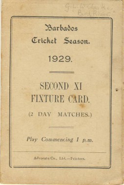 Single folded card with full fixture list for the Barbados Cricket Association 2nd XI matches in 1929 inside. Formerly the property of George Clarke of the Pickwick club.