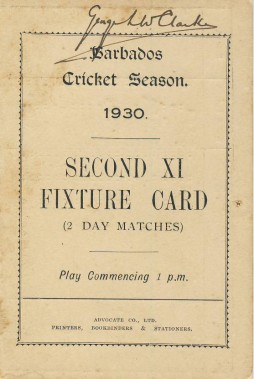 Single folded card with full fixture list for the Barbados Cricket Association 2nd XI matches in 1930 inside and continued on back. Formerly the property of George Clarke of the Pickwick club.