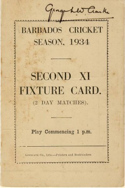 Single folded card with full fixture list for the Barbados Cricket Association 2nd XI matches in 1939 inside and continued on back. Formerly the property of George Clarke of the Pickwick club.