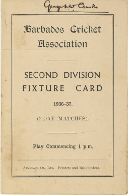 Single folded card with full fixture list for the Barbados Cricket Association 2nd Division matches in 1936-37 inside and continued on reverse. Formerly the property of George Clarke of the Pickwick club.