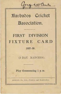 Single folded card with full fixture list for the Barbados Cricket Association 1st Division in the 1937-38 inside. Formerly the property of George Clarke of the Pickwick club.