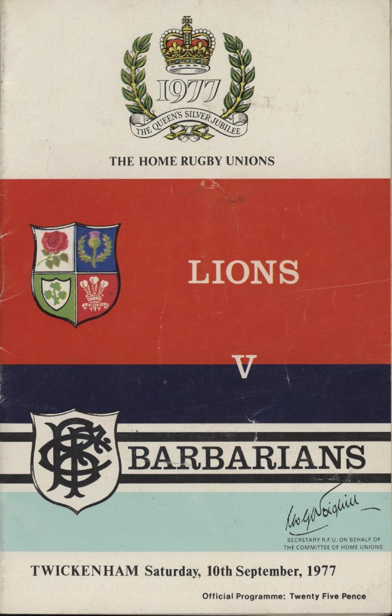 Official programme for the Queen's Silver Jubilee Match between the 1977 British Isles touring team and the Barbarians at Twickenham, 10th September 1977.