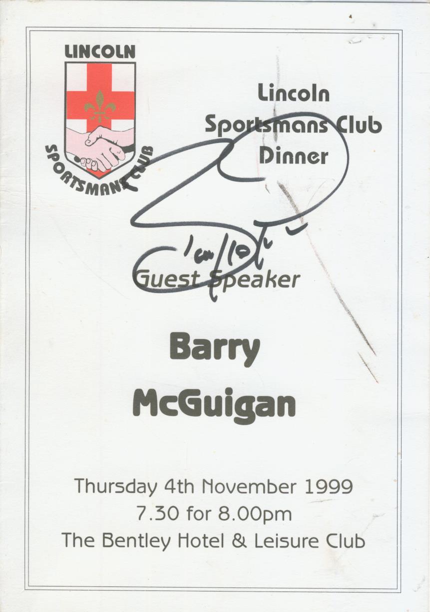 Menu card for the Lincoln Sportsmans Club Dinner, held on November 4th 1999. Barry McGuigan was the guest speaker, and he has signed it in ink to the front cover. Some other light ink marks to front. Very good.