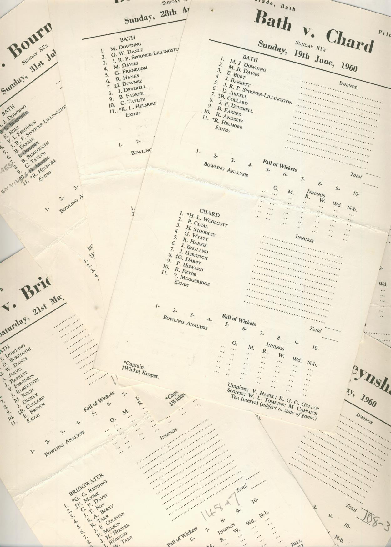 A group of 9 scorecards from games played at North Parade during the 1960 cricket season. Opposition includes Yeovil, Bournemouth, Bridgwater, Chard, Swindon and Taunton.