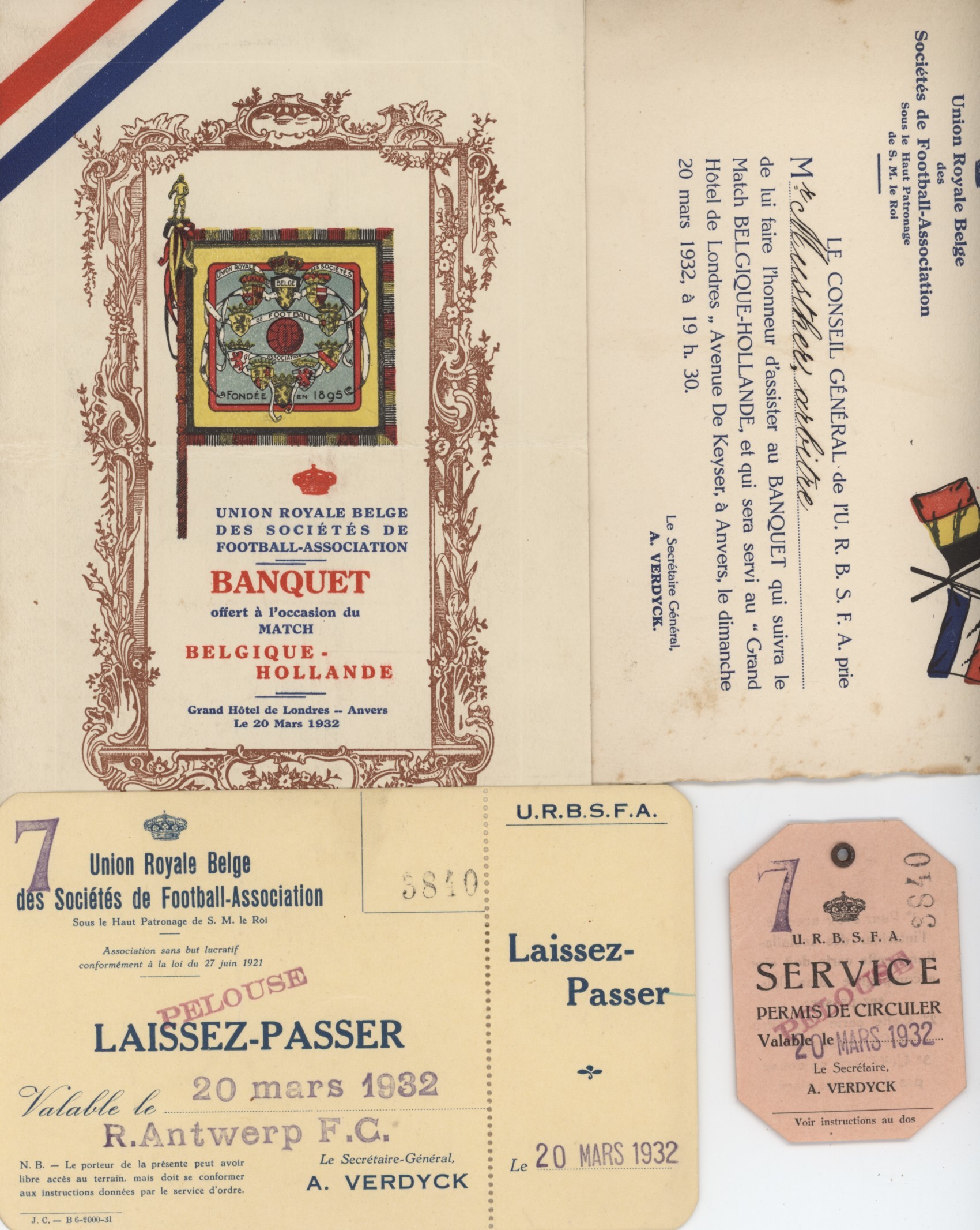 Menu card for a dinner banquet held following the match between Belgium and the Netherlands on May 20th, 1932. Holland won the match 4-1, with all four scored by Wim Lagendaal.