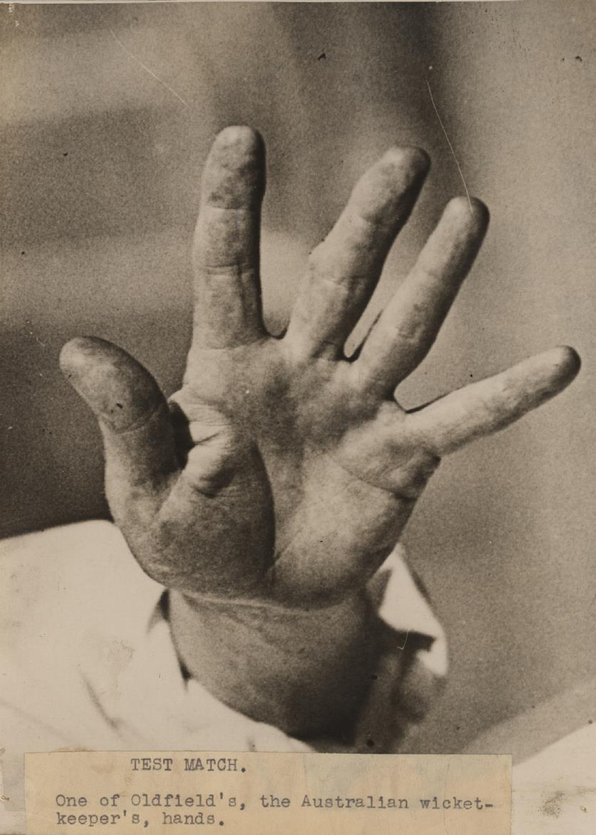 Origial Press photograph showing the hand (and broken finger) of the Australian wicket-keeper Bert Oldfield. Oldfield broke his finger just before he left Australia for the 1930 Ashes cricket tour, and the photograph was used by the Press to highlight how, despite the injury, he had lost none of his brilliance when stumping Frank Woolley first ball during the Test match at Trent Bridge.