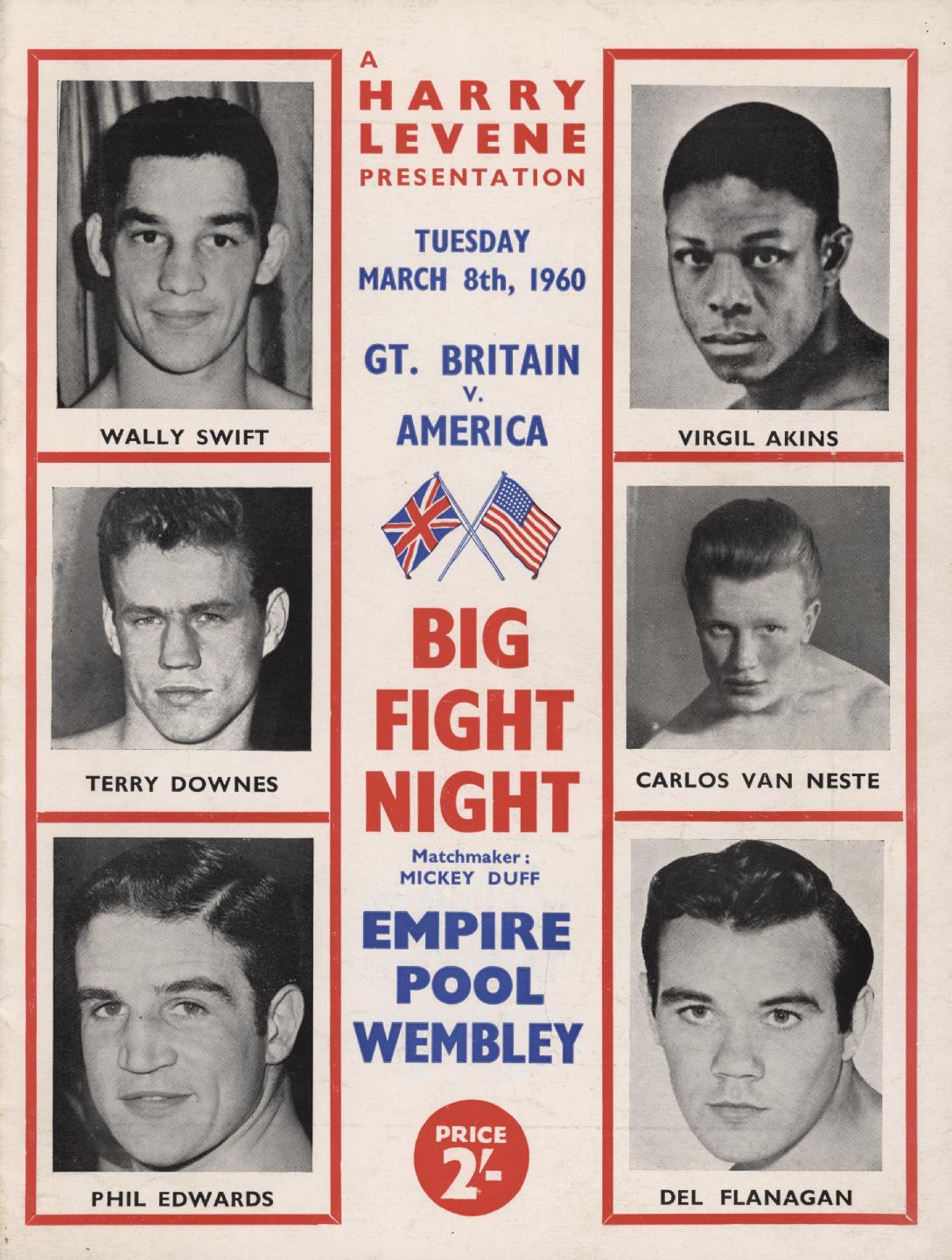 Official programme for the international fight night on 8 March 1960 at the Empire Pool, Wembley. Swift v Akins top of the bill, with Terry Downes v Carlos van Neste and Phil Edwards v Del Flanagan also on the card.