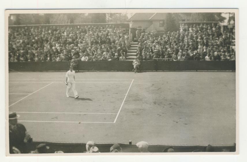 Tennis postcard. Rea photographic image of Bill Tilden (we believe - name written to reverse) walking on to court in front of a large crowd. The venue is not known. Postally unused. Very good condition.