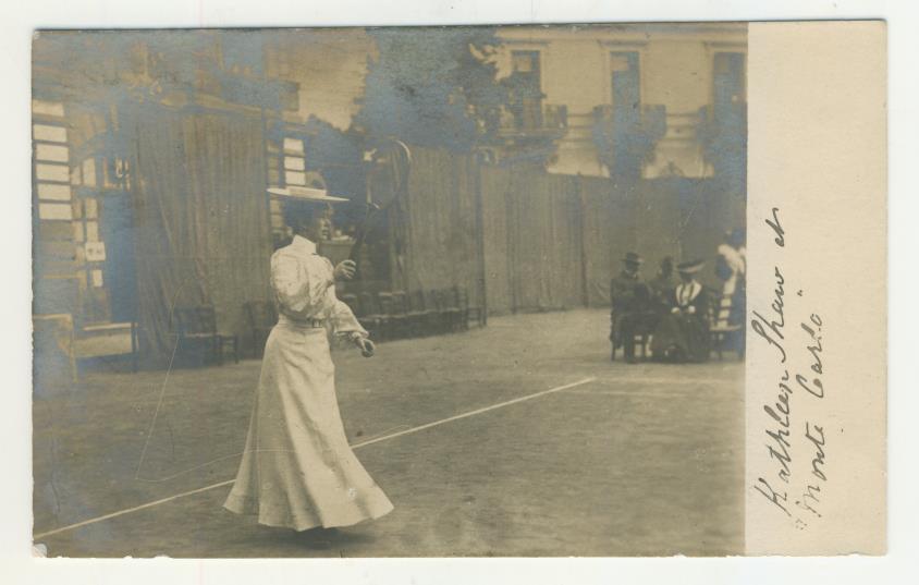 Tennis postcard. Photographic image of a lady (Kathleen Shaw) playing tennis in Monte Carlo. Late Victorian or Edwardian dress. Postally unused but caption written in ink to front. Very good condition.