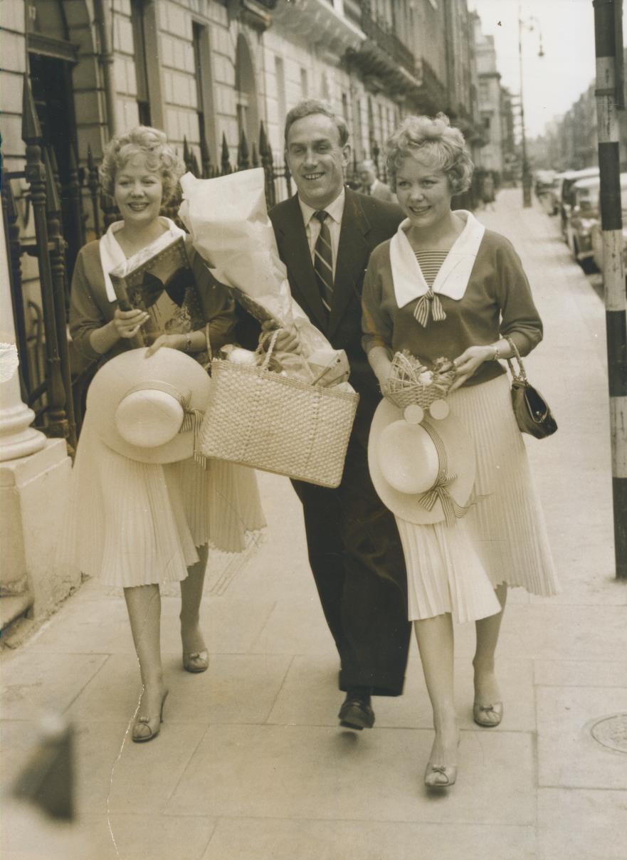 Original Press photograph of Billy Wright, the great Wolves and England footballer, walking alongside twins Teddy and Babs Beverley, dated April 6th 1959. They were visiting Wright's wife, Joy Beverley, who had just given birth to a baby daughter.