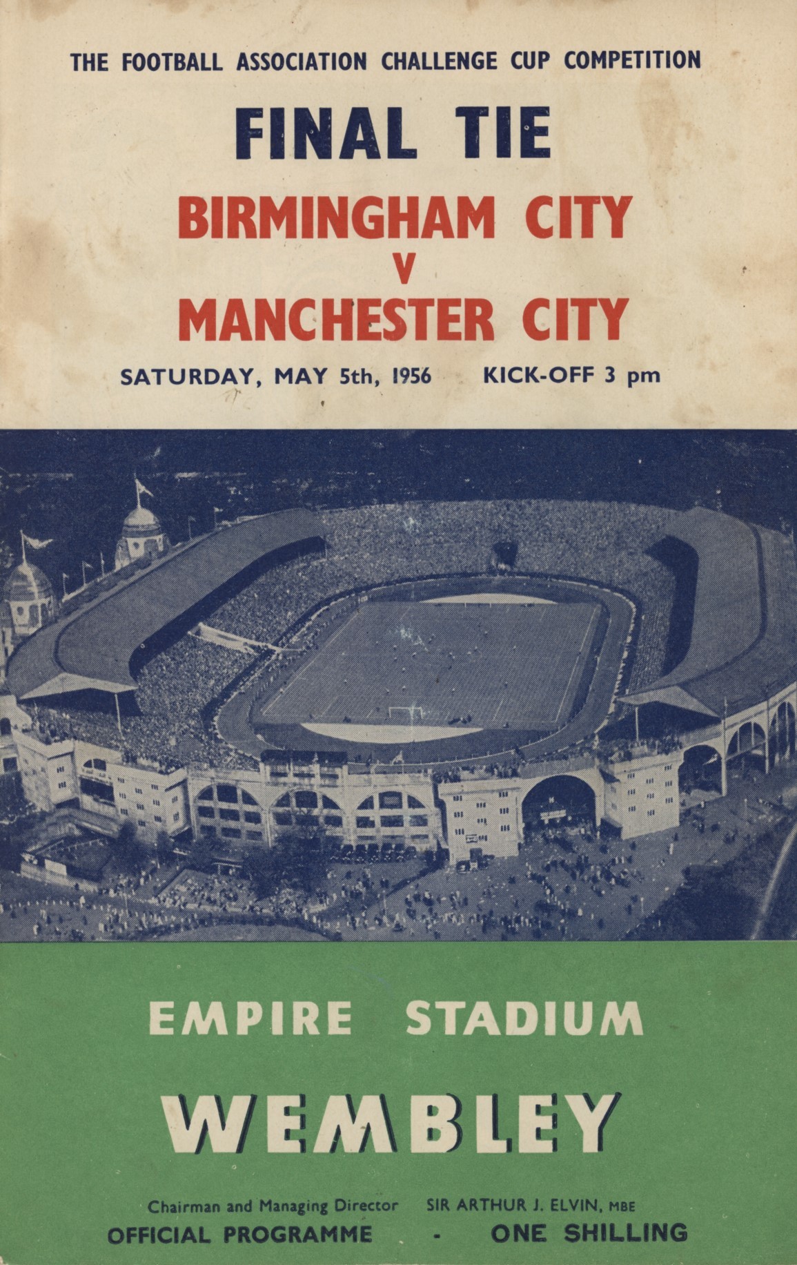 Official programme for the FA Cup Final between Birmingham City and Manchester City played at Wembley, May 5th 1956. Manchester City won 3-1, their goalkeeper Trautmann breaking his neck but gallantly playing on.