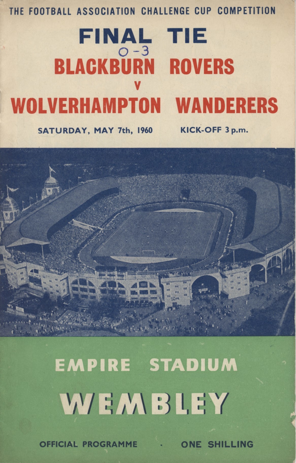 Official programme for the 1960 FA Cup Final between Blackburn Rovers and Wolverhampton Wanderers. Wolves won 3-0, with 2 goals from Deeley.
