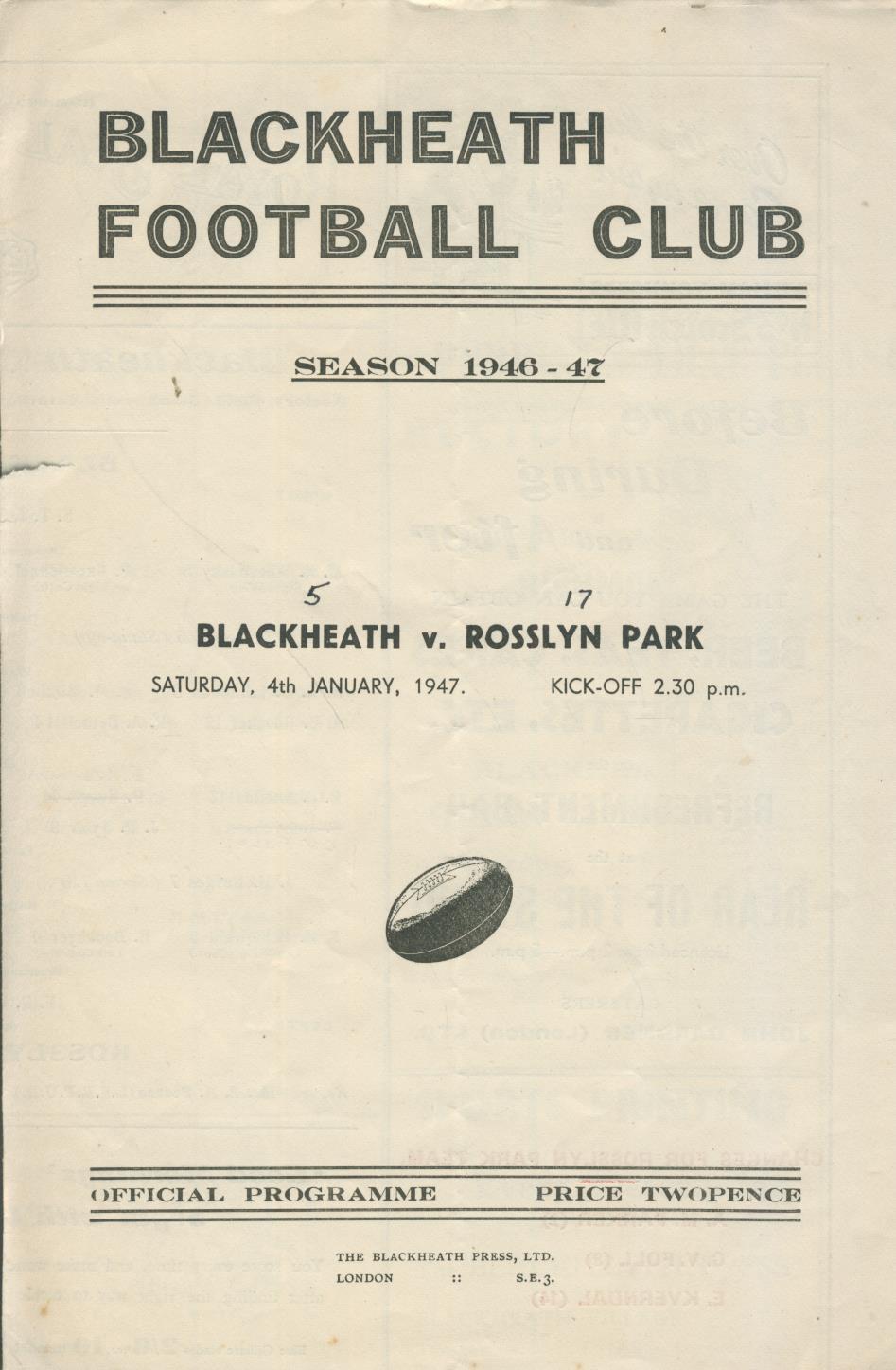 BLACKHEATH V ROSSLYN PARK 1947 RUGBY PROGRAMME
